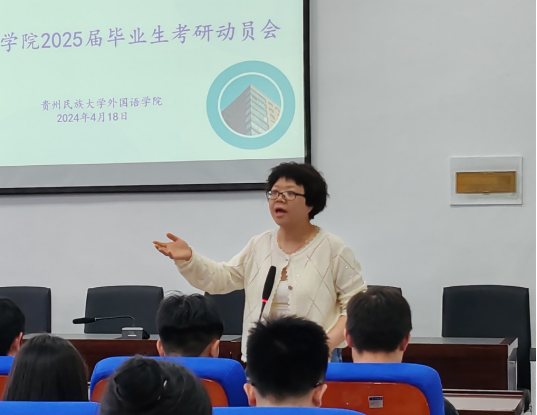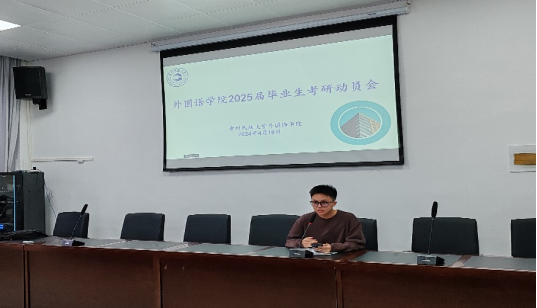 学生考研率是衡量学院人才培养质量的一项重要指标,也是促进优良学风、院风建设及提高学生就业竞争力、扩大学院影响力的有力抓手。为营造浓厚的考研氛围,切实加强对学生考研的指导与服务,提高学院考研的数量和质量,有力助推学院高质量发展,外国语学院于2024年4月18日晚上18:00在北校区星空官方网站(中国)416会议室举行2025届毕业生考研动员大会。会议由星空官方网站(中国)副院长赵艳主持,出席此次会议的还有学院日语系系主任李海老师、各辅导员、班主任。2020级部分学生代表、2021级全体学生参会。