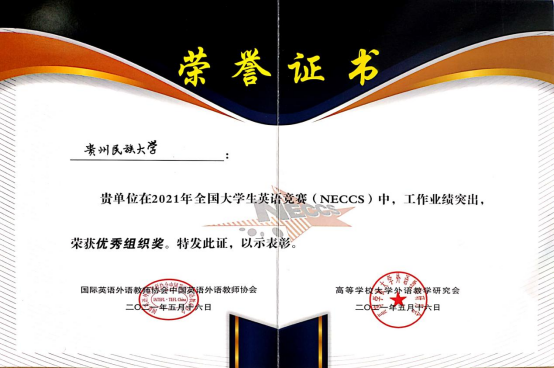 由于组织得力,业绩突出,贵州民族大学获得“优秀组织奖”荣誉证书。
