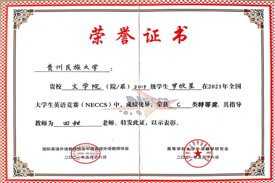田甜老师指导的文学院2019级罗欣星同学脱颖而出,一举夺得特等奖,获得8月2日到7日在广西桂林举办的“2021年全国大学生英语竞赛总决赛”资格。