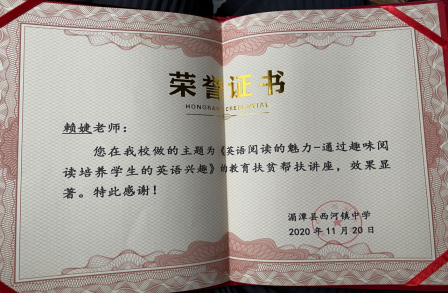 星空app官网老师赖婕,在2020年11月20号到湄潭县西河镇中学开展教育扶贫帮扶讲座,与该校英语教研组的老师进行了教学交流,并对该校9年级的学生上了一堂示范课,主题为“英语阅读的魅力-通过趣味阅读培养学生的英语兴趣”,课堂上通过师生互动,答题辅导等环节,让同学们体验了一堂生动有趣的英语课,取得了良好的教学效果,受到该中学师生的一致好评。