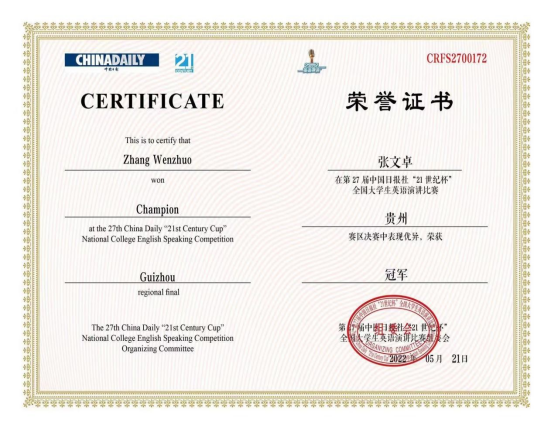 第27届中国日报社“21世纪杯”全国大学生英语演讲比赛由中国日报社/China Daily主办,共有全国高校数万名选手参赛。在历时七个多月的比赛中,我校星空官方网站(中国)、法学院的领导和指导老师龚坤给予了参赛学生悉心的赛前指导。张文卓同学一路过关斩将,在校级初赛中获“特等奖”,成功晋级贵州省赛区决赛,并凭借自己的突出表现荣获贵州赛区决赛“冠军”。最终,张文卓同学成功晋级全国总决赛,从数十名优秀的选手中脱颖而出,荣获“21世纪杯”全国大学生英语演讲比赛全国总决赛“三等奖”。