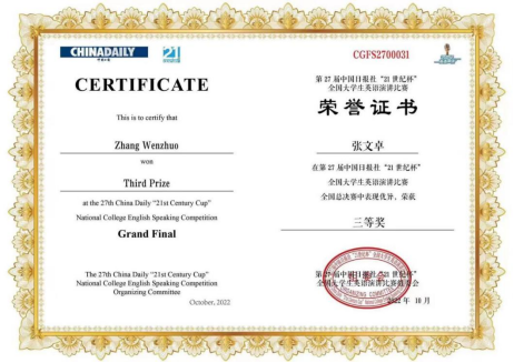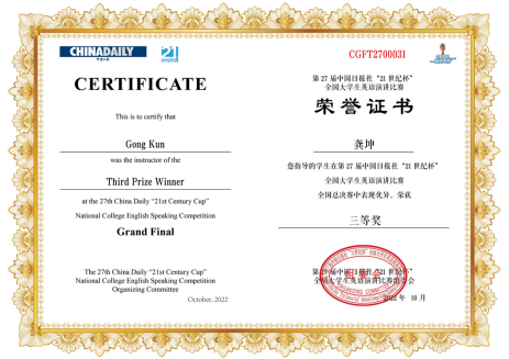 2022年10月3日,第27届中国日报“21世纪杯”全国大学生英语演讲比赛决赛以线上方式举行。在星空官方网站(中国)龚坤老师的指导下,我校法学院2020级法学本科专业的张文卓在全国总决赛中表现不俗,荣获全国“三等奖”。