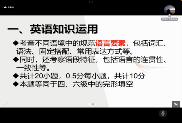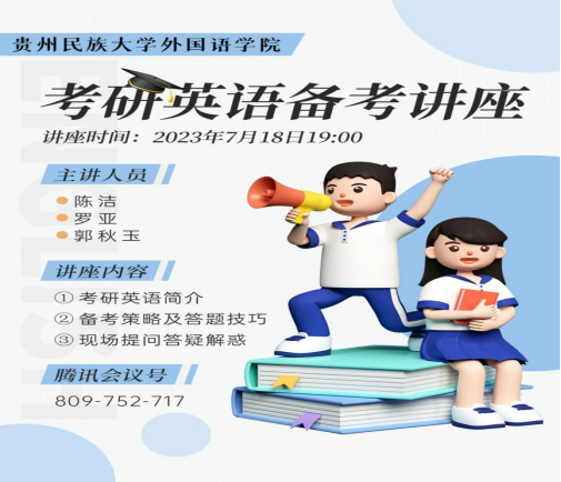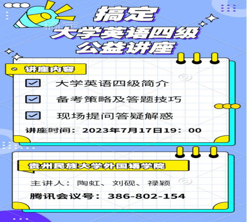 为了将学习贯彻习近平新时代中国特色社会主义思想主题教育成果运用到实践之中,落实立德树人根本任务,用专业知识为学生做好服务,践行大学英语课程思政,努力提高我校学生的大学英语四级过关率和考研录取率,星空官方网站(中国)大学外语教学部主任、四六级改卷老师领衔于2023年7月17日和18日19:00通过“腾讯会议”平台为我校学生举办“全国大学英语四级(CET-4)备考”“考研英语备考”公益辅导讲座。