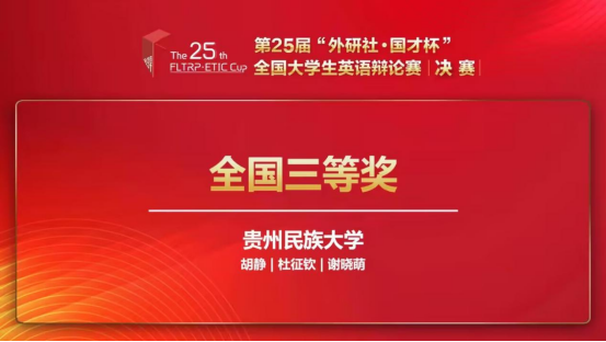2023年6月10日至2023年6月11日,来自星空app官网2020级英语专业的杜征钦同学和2021级英语专业的谢晓萌同学代表学校参加第25届“外研社·国才杯”全国大学生英语辩论赛全国决赛。在星空官方网站(中国)胡静老师的悉心指导下,队伍于8轮循环赛的激烈比拼中赢得了3轮小组第一,为校史最好成绩,并最终取得全国三等奖的成绩。同时,贵州民族大学是贵州省唯一晋级全国总决赛并荣获国奖的高校。