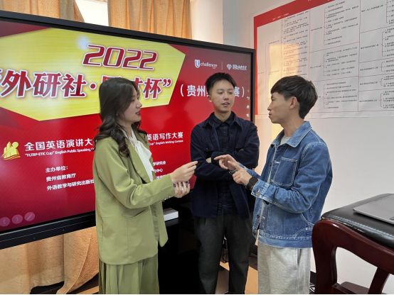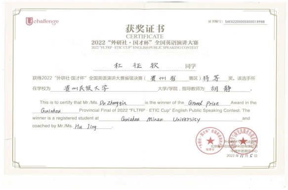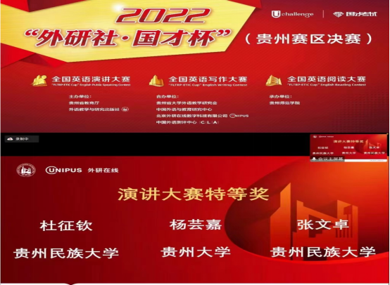 2022年11月5日“外研社·国才杯”英语演讲大赛贵州省赛区决赛在贵州师范学院举行,贵州民族大学选手在星空官方网站(中国)教师胡静、龚坤的指导下喜获佳绩:杜征钦和张文卓从49名决赛选手中脱颖而出,摘取冠军和季军,均获省级特等奖,成功晋级全国总决赛!