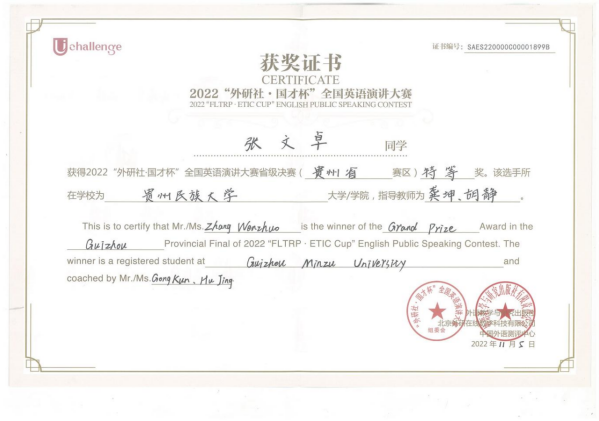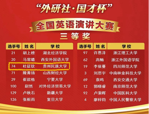 “外研社·国才杯”英语演讲大赛是外语类列入中国高等教育学会高校竞赛排行榜首位的比赛。日前贵州民族大学2020级英语专业的杜征钦同学和2020级法学专业的张文卓同学双双荣获2022年“外研社·国才杯”英语演讲大赛全国总决赛三等奖!