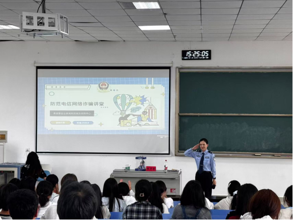 学院还邀请了贵安新区公安局侦防中心民警陈方金开展安全教育。陈方金民警结合真实案例,围绕校园反诈、消防安全、出行安全等重点内容,讲解风险识别与防范技巧,提醒同学们提高安全警惕,筑牢自我防护意识,为校园安全增添坚实保障。