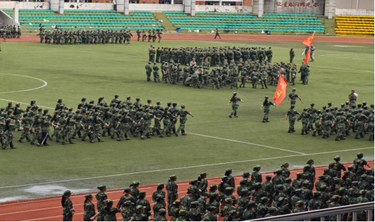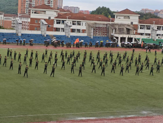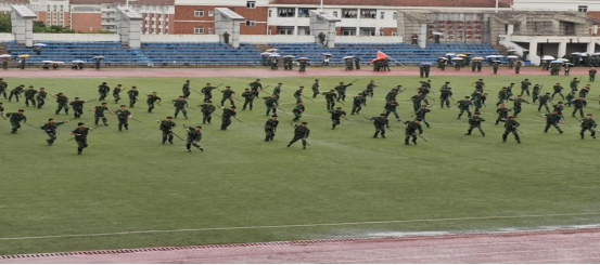 少年强,则国强。早上八点,同学们准时起床前往体育场进行军事技能训练。到达体育场后,大家迅速集合站好队伍,在教官的指令下,开始了一天的军事技能训练。从稍息、立正到跨立、到齐步走,每一个动作同学们都做得格外认真,尽管秋风和细雨带来了一些凉意,但没有一个人喊苦喊累。