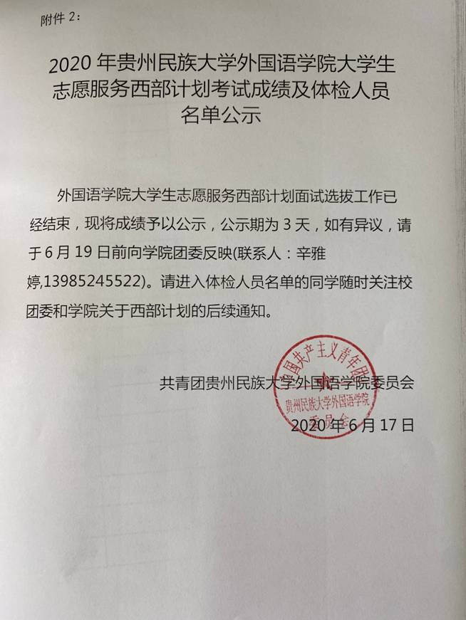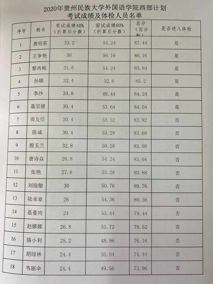 2020年星空app官网大学生志愿服务西部计划考试成绩及体检人员名单公示